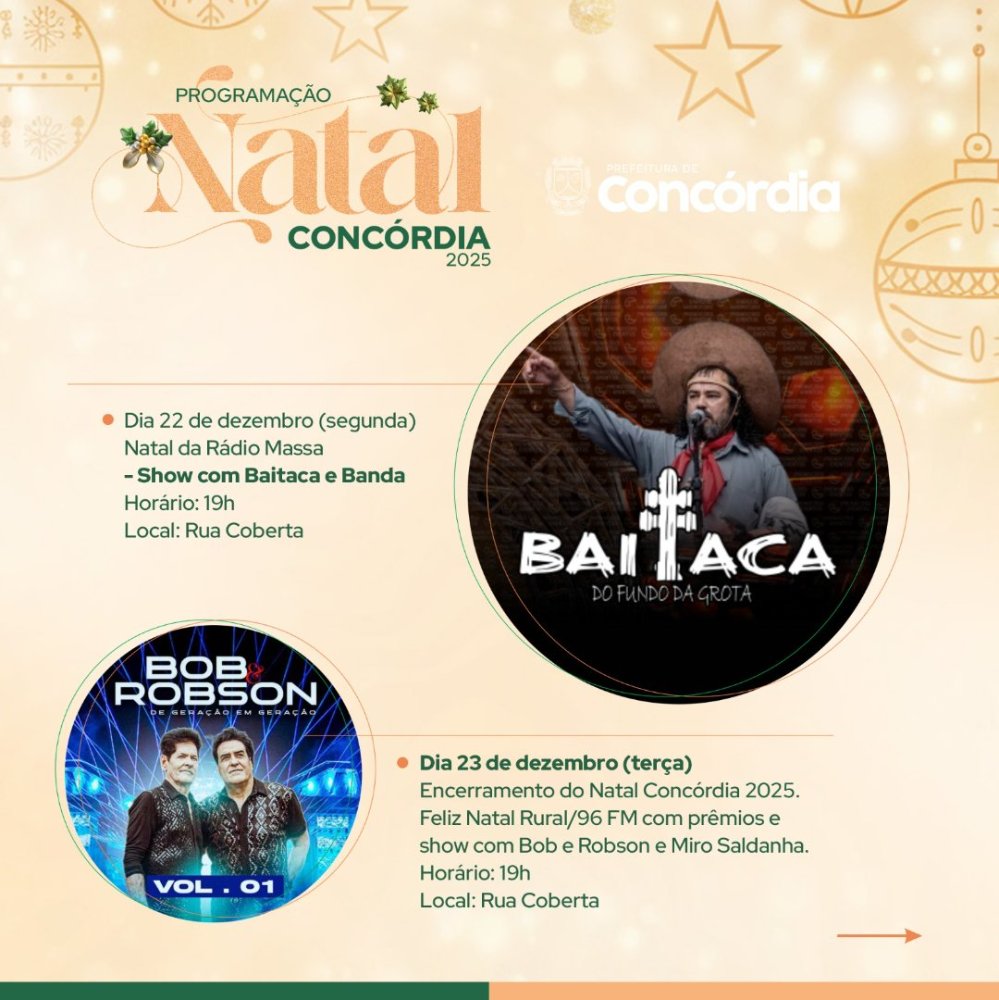 O encerramento da programação ocorrerá no dia 23 de dezembro, promovido pela Rádio Rural, com shows de Bob e Robson, dupla sertaneja, e do cantor Gaúcho nativista Miro Saldanha.